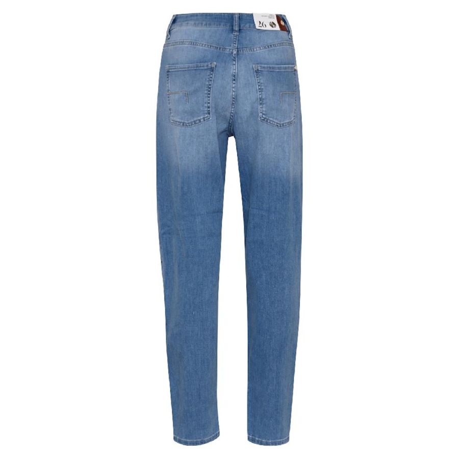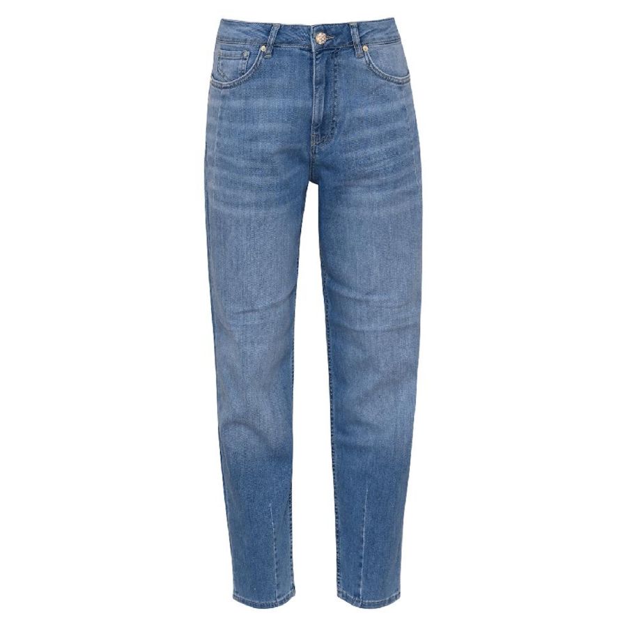 Carrot fit 5 pocket jeans met high waist in een mooie heldere blauwe kleur. De jeans heeft een fancy knoop en draagt comfortabel door de stretch.